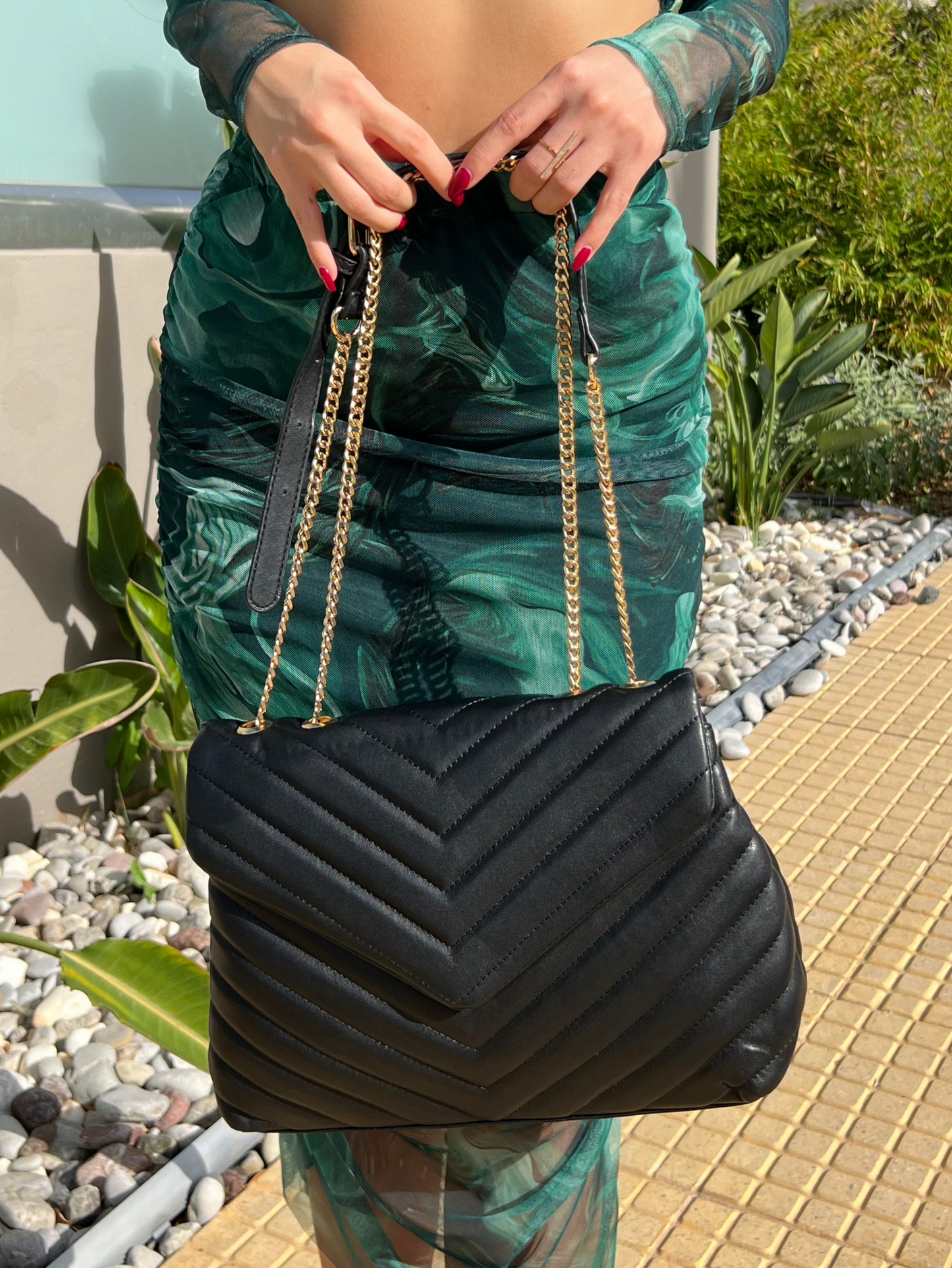 Αναδείξτε το στυλ σας με αυτή την εντυπωσιακή τσάντα faux leather, που διαθέτει κομψή χρυσή αλυσίδα. Με ευέλικτο σχεδιασμό, μπορείτε να την φορέσετε χιαστί ή στον ώμο, κάνοντάς την ιδανική επιλογή για όλες τις περιστάσεις.