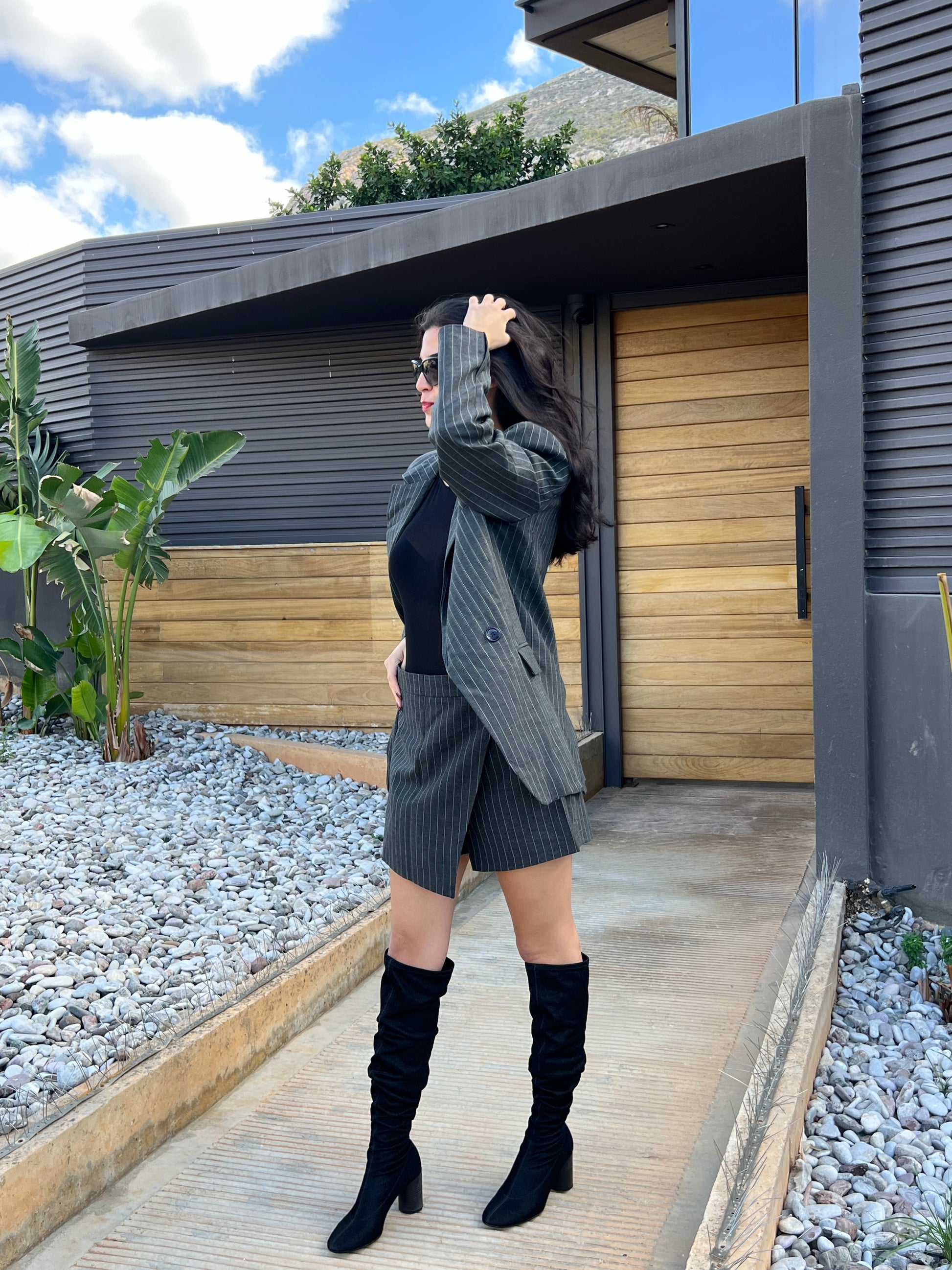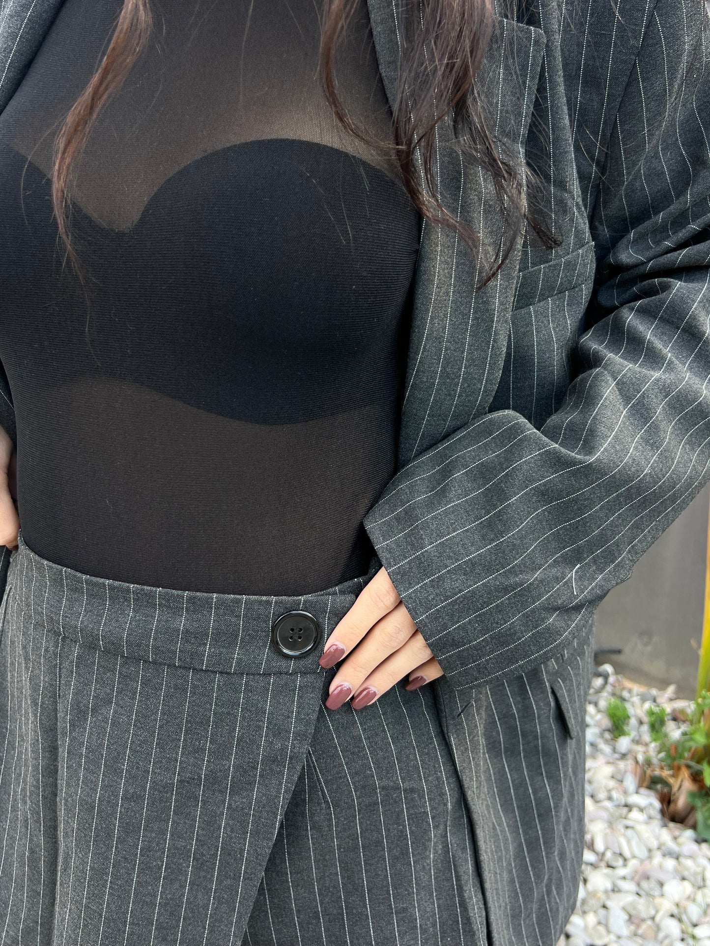 Σετ ριγέ ανθρακί. Oversized blazer με βάτες, διπλοκουμπωτό.